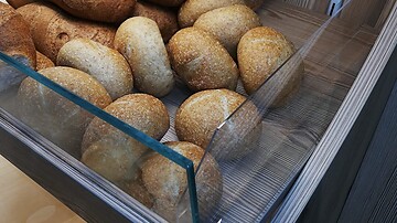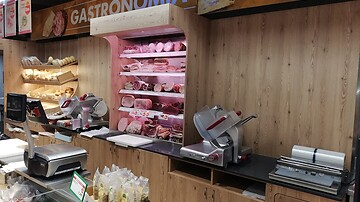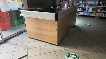 Lieferung und Montage einer neuen Lärchenholzverkleidung für die vorhandenen Kühlmöbel, Waagen, Kassen, Schwingtüren, 2 Brotmodule und eine Theke mit Waschbereich und Marmorplatte. Lieferung und Montage von Intrac-Regalen und anderer Einrichtungselemente.