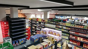 Anlieferung Kühl- und Tiefkühlmöbel Arneg. Einrichtung komplett mit Kassamöbel Intrac.