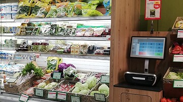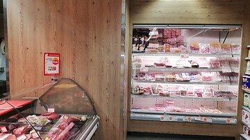 Fornitura e installazione nuova ambientazione in legno di larice per mobili refrigerati esistenti, porta bilance, casse, porte va e vieni, 2 moduli pane e retrobanco completo di zona lavaggio e piano in marmo. Fornitura ed installazione completamenti scaffalatura neutra Intrac ed altri elementi di arredamento.